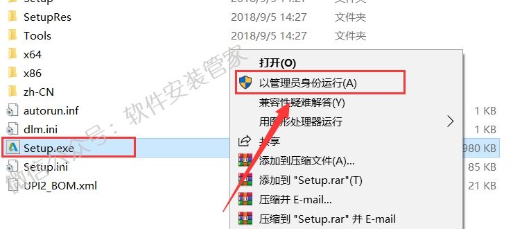 4.选中【setup】可执行文件,鼠标右击选择【以管理员身份运行】。