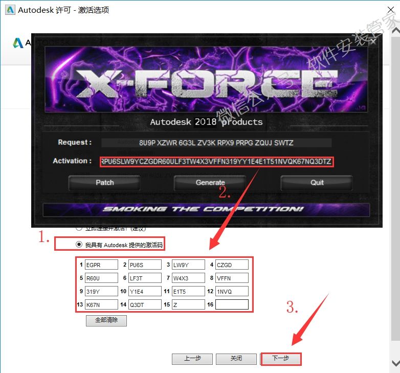 23.点击【我具有Autodesk提供的激活码】,Ctrl+C复制【Activation】中的激活码,Ctrl+V粘贴到【我具有Autodesk提供的激活码】的下面的方格中,然后点击【下一步】。
