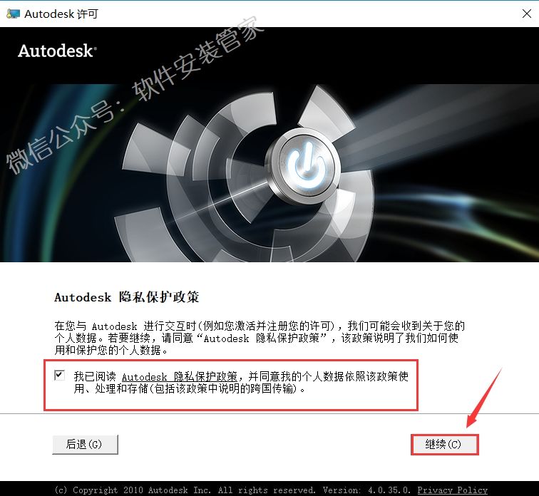 14.勾选【我已阅读Autodesk 隐私保护政策,并同意我的个人数据按照该政策使用、处理和储存(包括该政策中说明的跨国传输)】,点击【继续】。