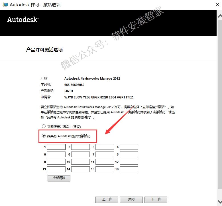 3.复制【Autodesk】提供的激活码时,直接全选激活码(快捷键Ctrl+A),复制激活码,点击【我具有Autodesk提供的激活码】在方框里面粘贴即可完成复制。