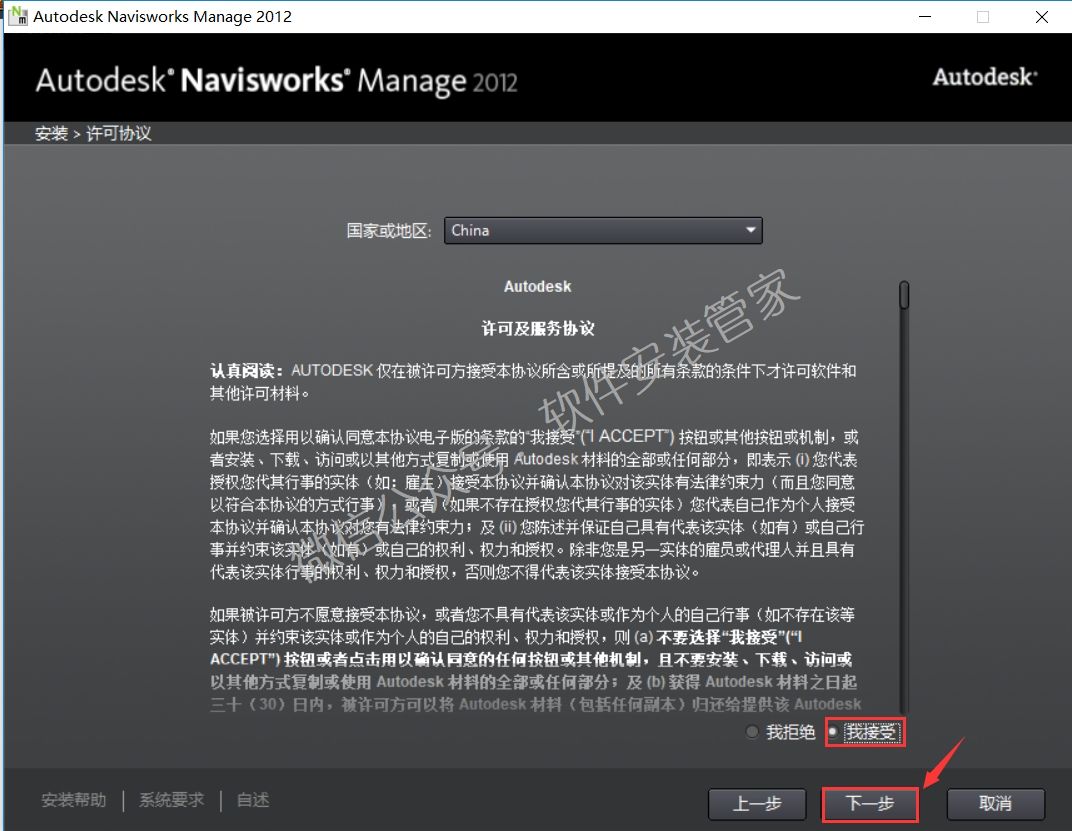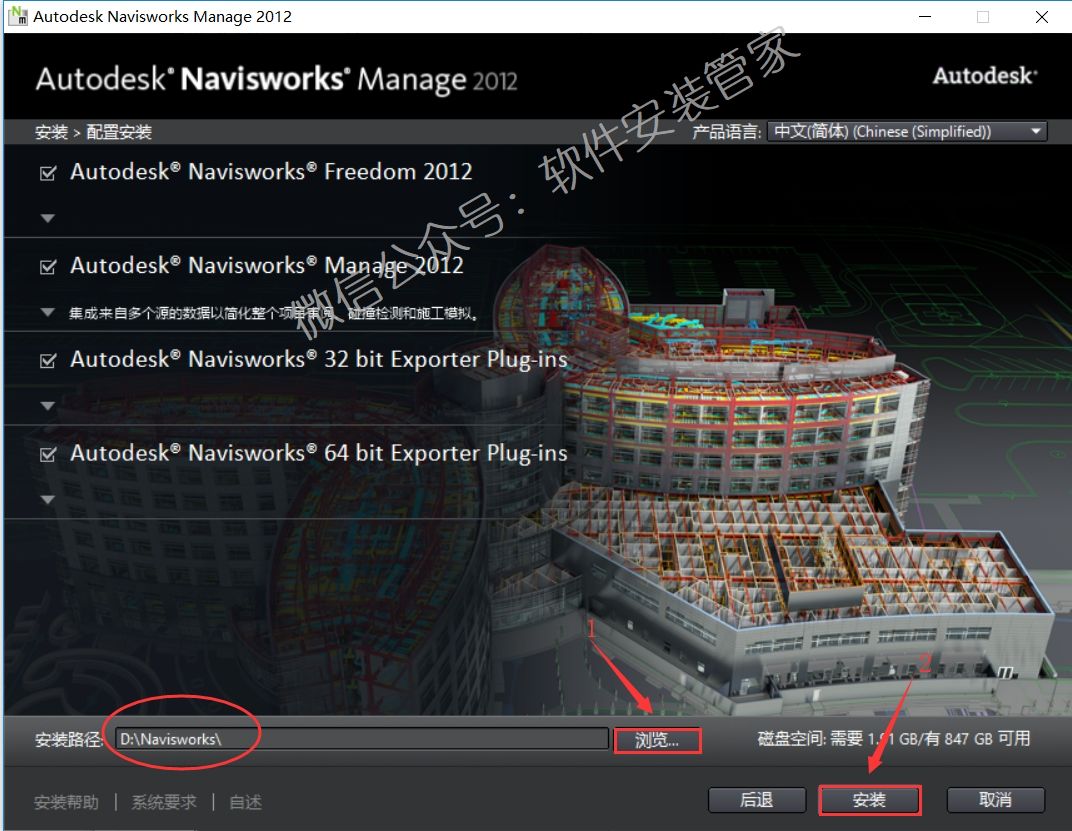 9.点击【浏览】更改软件的安装目录,建议安装在除C盘之外的磁盘,可以在D盘或其它盘里面新建一个【Navisworks】的文件夹,然后点击【安装】。