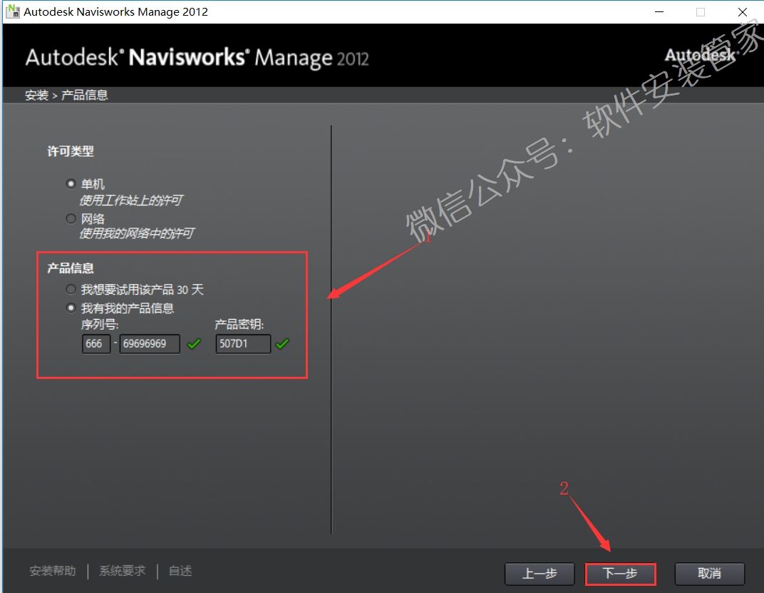 8.输入序列号:666-69696969,产品密钥:507D1,点击【下一步】。