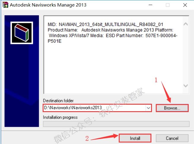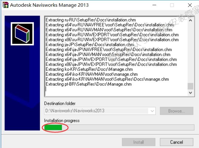 5.点击【Browse...】更改软件的解压目录,建议解压在除C盘之外的磁盘,可以在D盘或其它盘里面新建一个【Navisworks2013】的文件夹,然后点击【Install】。