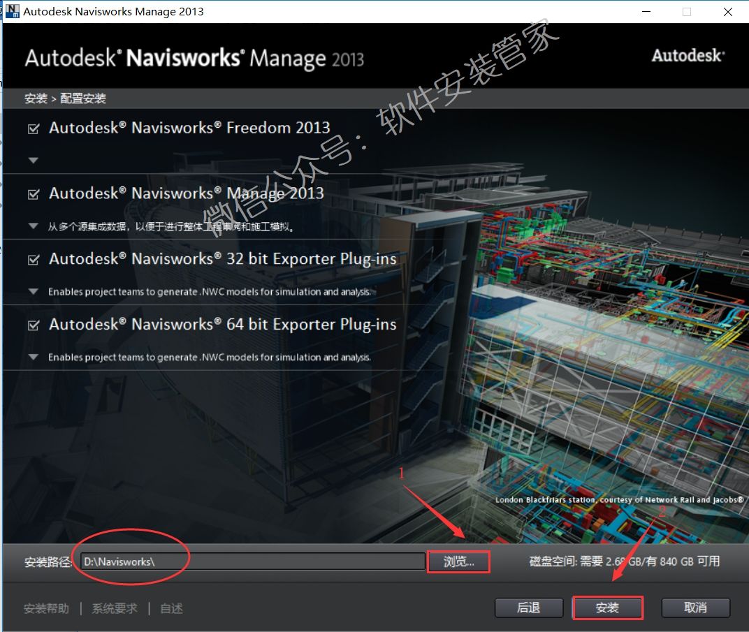 10.点击【浏览】更改软件的安装目录,建议安装在除C盘之外的磁盘,可以在D盘或其它盘里面新建一个【Navisworks】的文件夹,然后点击【安装】。
