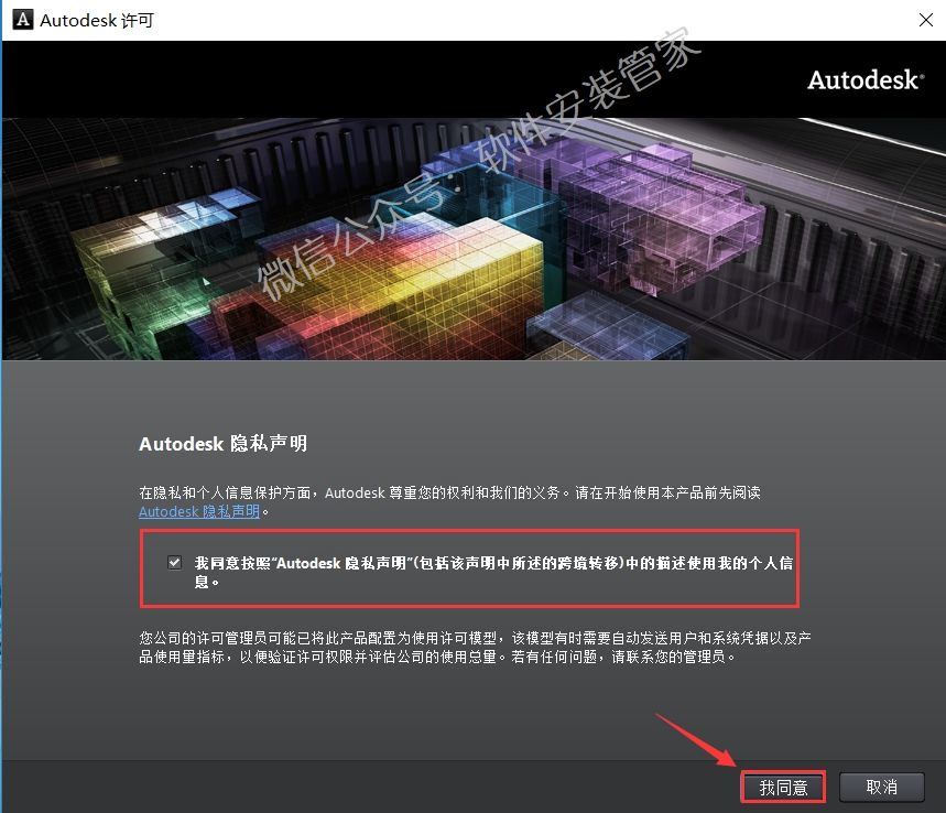 14.选择【我同意按照“Autodesk 隐私声明”(包括该声明中所述的跨境转移)中的描述使用我的个人信息。】,点击【我同意】。