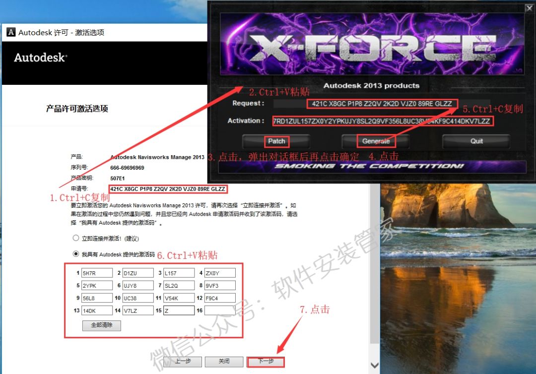 21.把【申请号】复制到注册机里面的【Request】中(记得删除原【Request】中的内容),先点击【Patch】弹出对话框后再点击确定,再点击【Generate】后复制【Activeation】中生成的激活码,然后粘贴激活码至【我具有Autodesk提供的激活码】方框中。最后点击【下一步】即可。