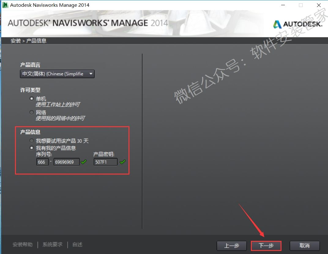 9.输入序列号:666-69696969,产品密钥:507F1,点击【下一步】。