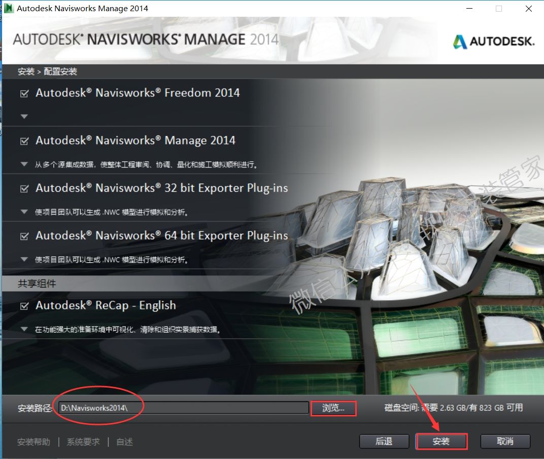 10.点击【浏览】更改软件的安装目录,建议安装在除C盘之外的磁盘,可以在D盘或其它盘里面新建一个【Naviworks2014】的文件夹,然后点击【安装】。
