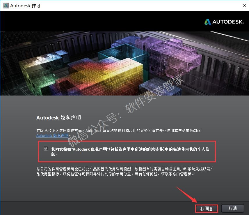 15.选择【我同意按照“Autodesk隐私说明”(包括该声明中所述的跨境转移)中的描述使用我的个人信息。】,点击【我同意】。