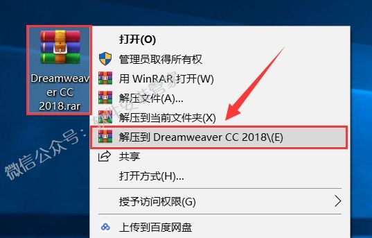 1.选中【Dreamweaver CC 2018】压缩包,鼠标右击选择【解压到DreamweaverCC 2018】。