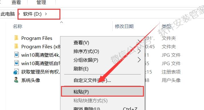 16.打开需要更改到的磁盘后,鼠标右击选择粘贴即可。我更改到D盘,所以打开D盘后,在空白处鼠标右击选择【粘贴】。