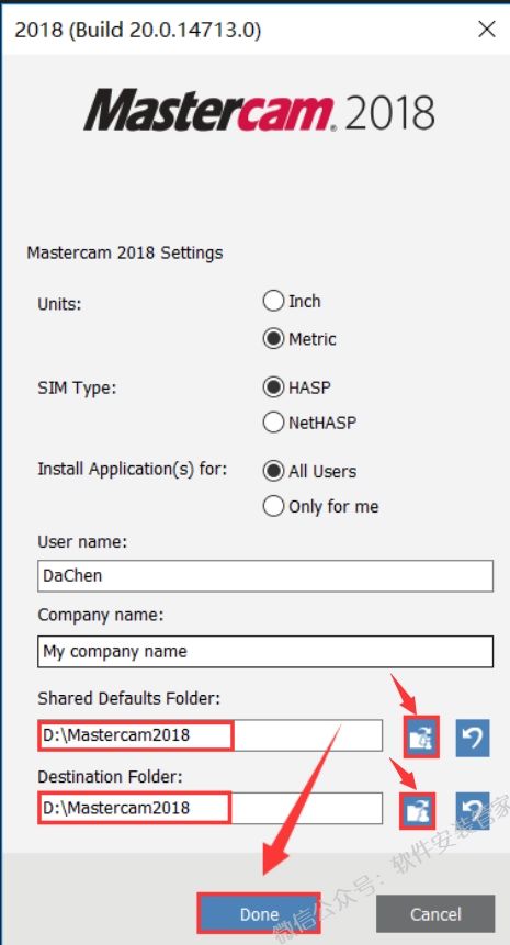 9.点击【文件夹】图标,更改软件的安装目录,建议安装在除C盘之外的磁盘,可以在D盘或其他盘新建一个【Mastercam2018】文件夹,然后点击【Done】。