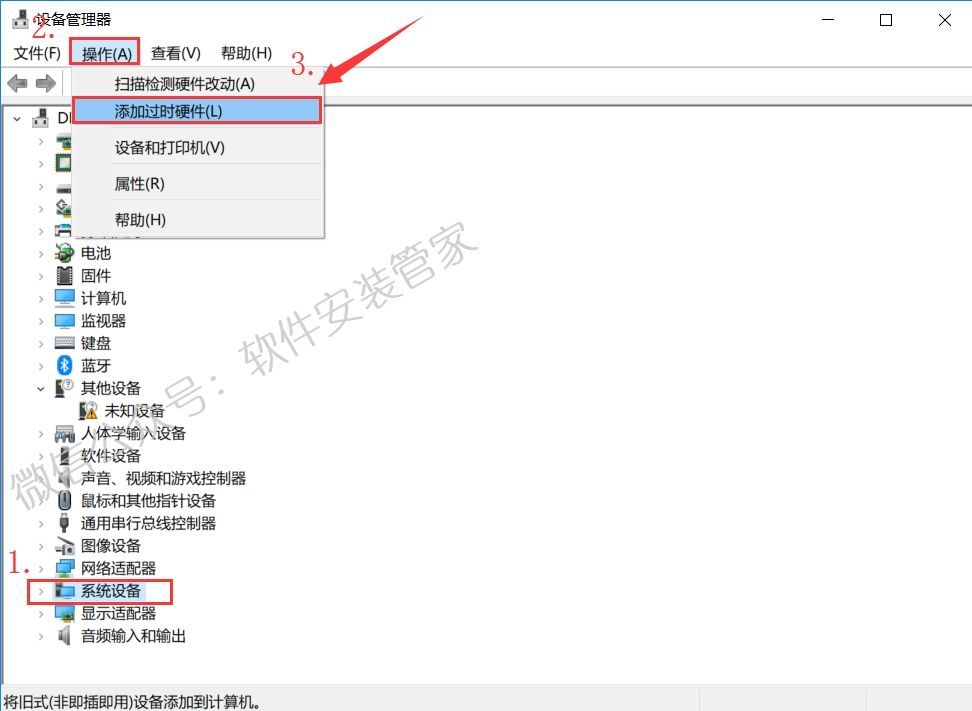 20.点一下【系统设备】,再点击【操作】,然后点击【添加过时硬件】。