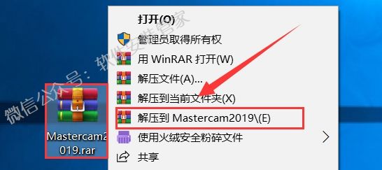 1.选中【Mastercam2019】压缩包,鼠标右击选择【解压到Mastercam2019】。