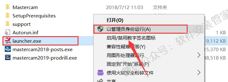 4.选中【launcher】可执行程序,鼠标右击选择【以管理员身份运行】。