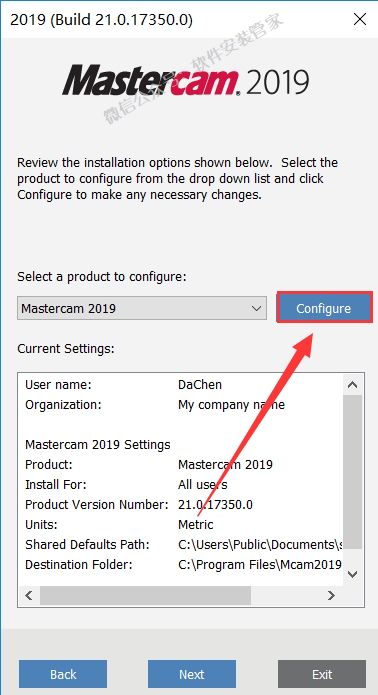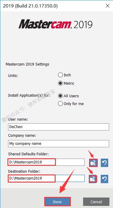 9.点击【文件夹】图标,更改软件的安装目录,建议安装在除C盘之外的磁盘,可以在D盘或其他盘新建一个【Mastercam2019】文件夹,然后点击【Done】。