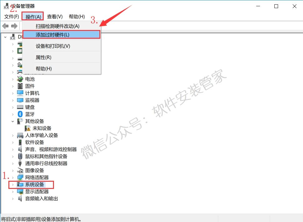 20.点一下【系统设备】,再点击【操作】,然后点击【添加过时硬件】。