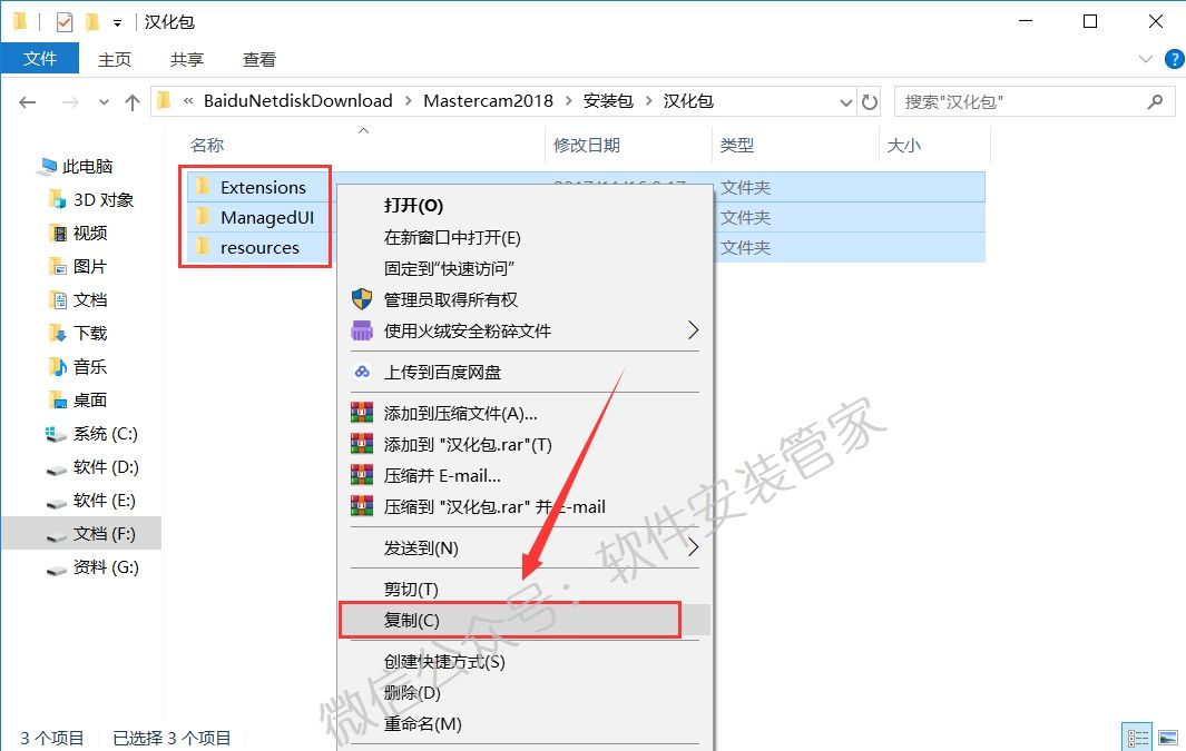 33.快捷键:Ctrl+A全选【汉化包】文件夹内的所有文件,鼠标右键点击,选择【复制】。