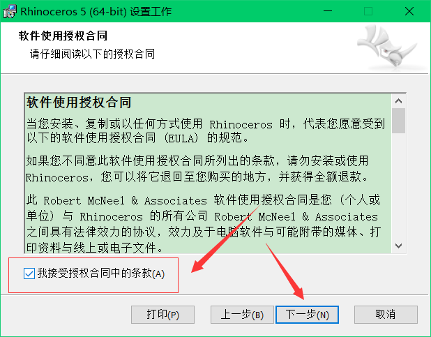 6. 点击浏览更改软件安装路径:建议安装到除C盘以外的磁盘,可在D盘或其它盘里面新建一个文件夹rhino5.0。点击下一步