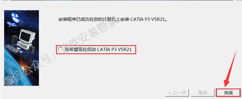 20.去掉“我希望现在启动CATIA P3 V5R21”前面的勾,然后点击“完成”。