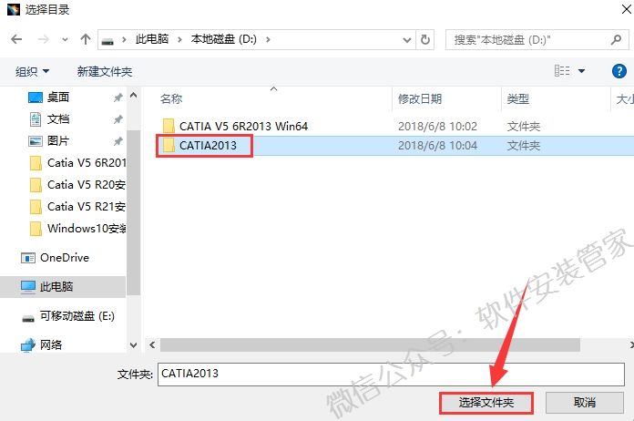 7.选择在D盘或其它盘中新建的“CATIA2013”文件夹,选中后点击“选择文件夹”。