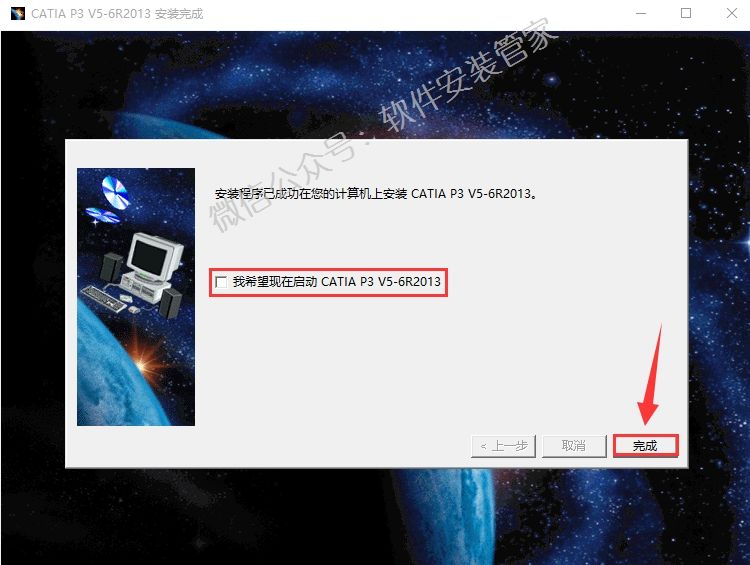 20.去掉“我希望现在启动CATIA P3 V5-6R2013”前面的勾,然后点击“完成”。