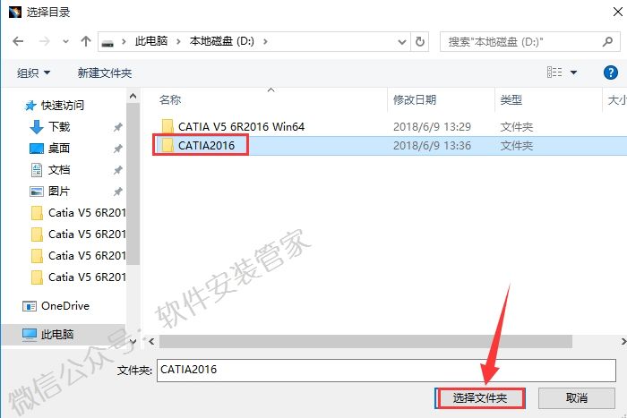 7.选择在D盘或其它盘中新建的“CATIA2016”文件夹,选中后点击“选择文件夹”。