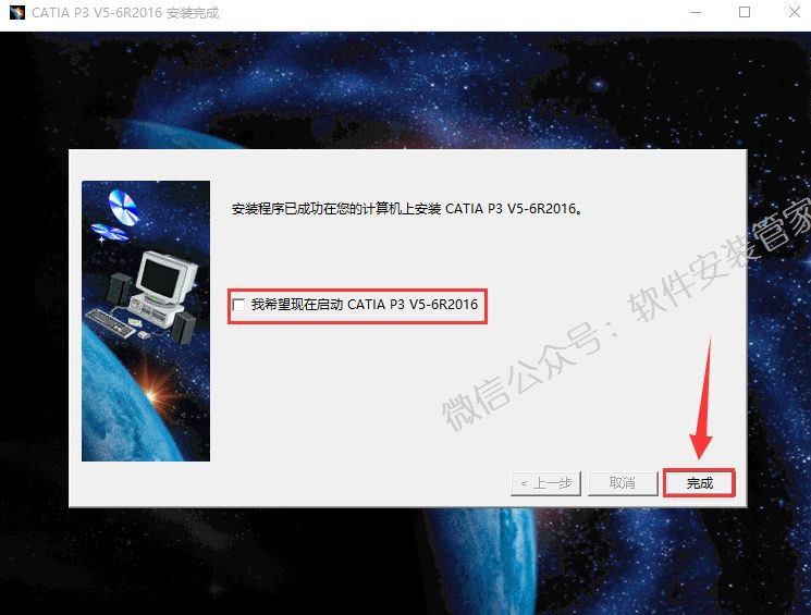 20.去掉“我希望现在启动CATIA P3 V5-6R2016”前面的勾,然后点击“完成”。