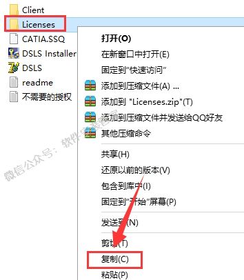 46.在解压出的文件夹中找到“Licenses”选中后鼠标右击选择“复制”。