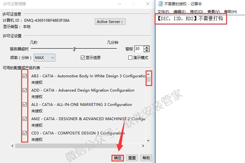 54.拖动许可证管理器中的滚轮,勾选除了“DIC、I3D、ED2”这三个以外的所有选项,然后点击“确定”最后重新启动软件即可。