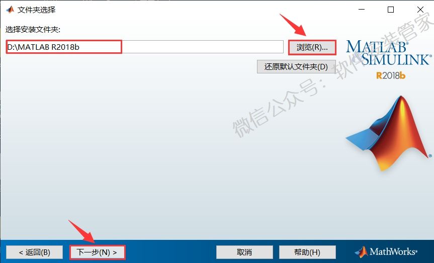 8.点击【浏览】更改软件的安装路径,建议安装在除C盘之外的其他磁盘,可以在D盘后或其他盘新建一个【MATLAB R2018b】文件夹,然后点击【下一步】。