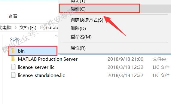 19.打开安装包解压后的【Matlab R2018b】文件夹里面的【crack】文件夹,选中【bin】文件,鼠标右击选择【复制】。