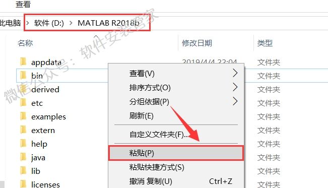 20.打开软件的安装目录,在空白处鼠标右击选择【粘贴】,教程中的安装路径是【D:\MATLAB R2018b】。