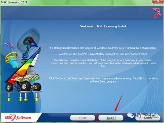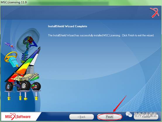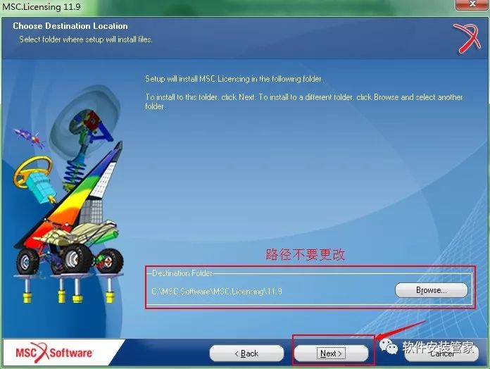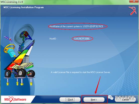 23、安装完成后会弹出以下界面,点击“Browse”选择前面生成的许可文件license.dat,路径C:\MSC.Software\MSC.Licensing\11.9\license.dat,然后点击Next。