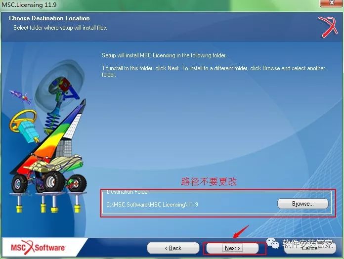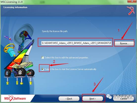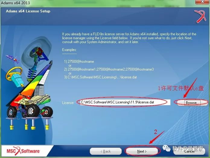 23、安装完成后会弹出以下界面,点击“Browse”选择前面生成的许可文件license.dat(第11步许可证生成路径),路径C:\MSC.Software\MSC.Licensing\11.9\license.dat.然后点击Next。