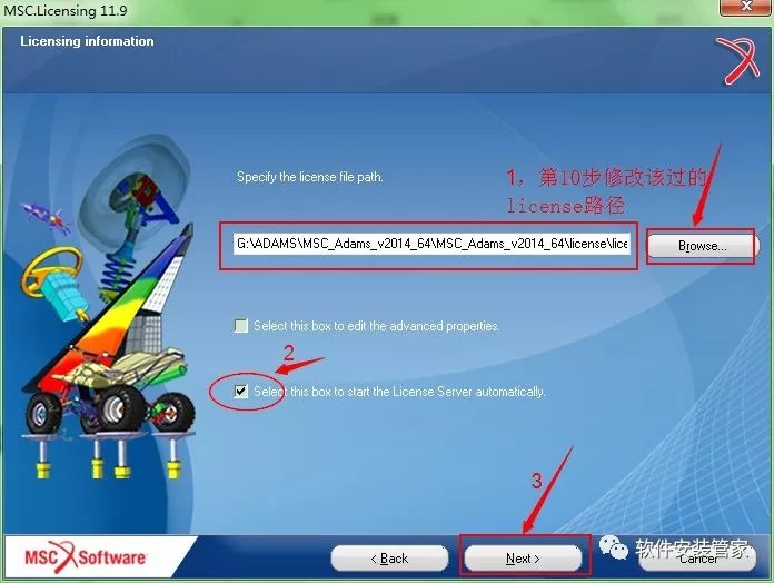 30、安装完成后会弹出以下界面,点击“Browse”选择前面(第17步)生成的新许可文件license.dat,路径C:\MSC.Software\MSC.Licensing\11.9\license.dat,然后点击Next。