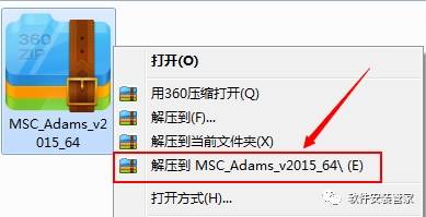 1、右击软件压缩包,选择解压到“MSC_ADAMS_v2015_64”。