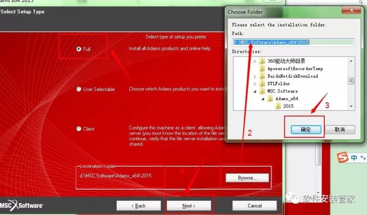 26、选择安装模式和安装目录,点击“FUll”,然后点击“Browse”更改安装路径,建议安装到除C盘的以外的其他磁盘,可在D盘新建一个Adams2015文件夹,然后点击Next。