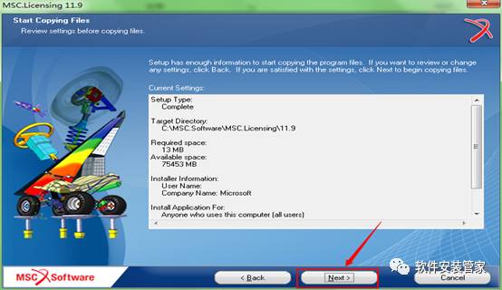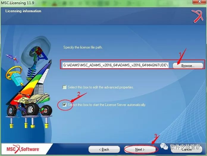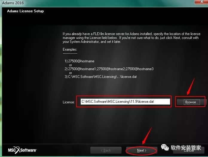 23、安装完成后会弹出以下界面,点击“Browse”选择前面生成的许可文件license.dat(许可安装中新生成的),路径C:\MSC.Software\MSC.Licensing\11.9\license.dat,然后点击Next。