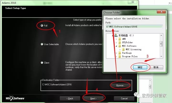 20、选择安装模式和安装目录,点击“FUll”,然后点击“Browse”更改安装路径,建议安装到除C盘的以外的其他磁盘,可在D盘新建一个Adams2016文件夹,然后点击Next。