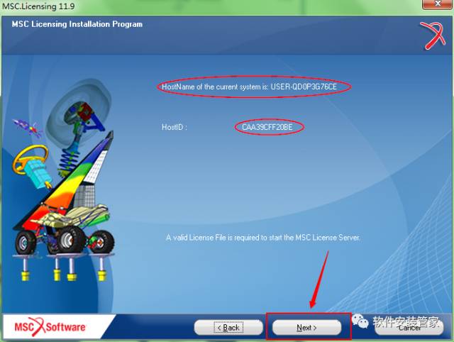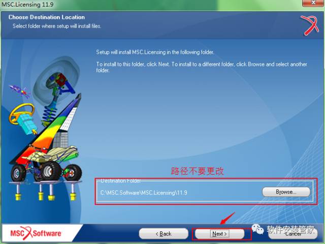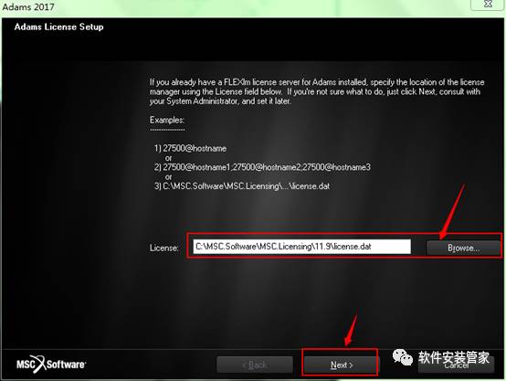 24、安装完成后会弹出以下界面,点击“Browse”选择前面生成的许可文件license.dat(许可安装中新生成的),路径C:\MSC.Software\MSC.Licensing\11.9\license.dat,然后点击Next。