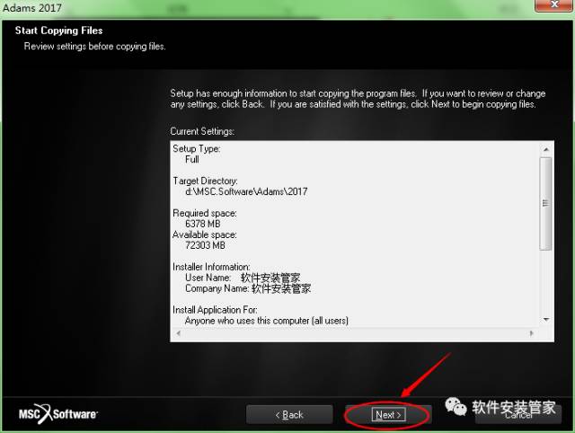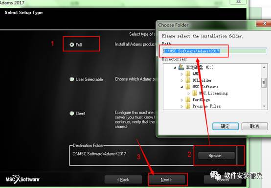 21、选择安装模式和安装目录,点击“FUll”,然后点击“Browse”更改安装路径,建议安装到除C盘的以外的其他磁盘,可在D盘新建一个Adams2017文件夹,然后点击Next。