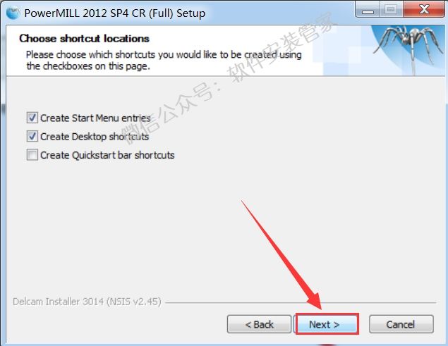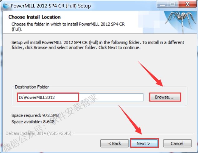 7.点击【Browse】更改软件安装路径:建议安装到除C盘以外的磁盘,可在D盘或其它盘里面新建一个【PowerMILL2012】文件夹,鼠标点击【Next】。
