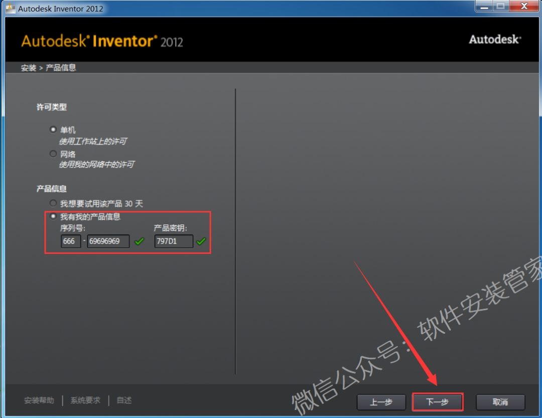 7.输入序列号:666-69696969,产品密钥:797D1,然后点击【下一步】。