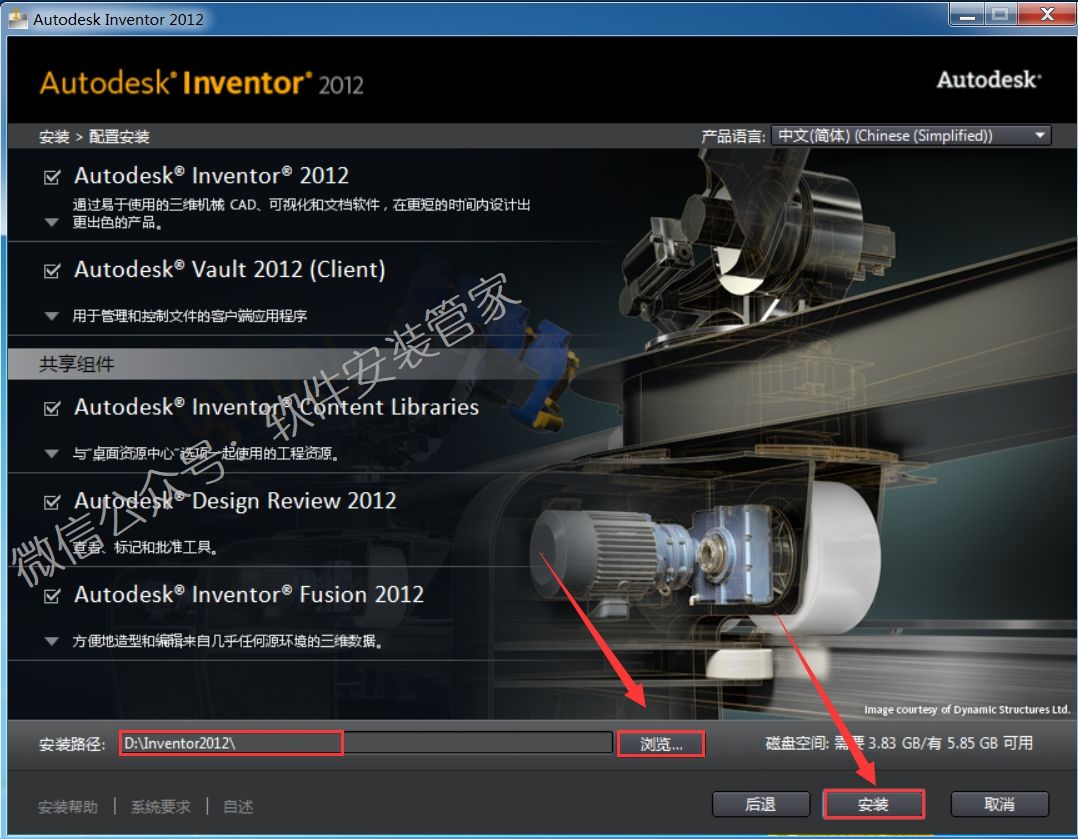 9.点击【浏览】更改软件的安装目录,建议安装在除C盘之外的其他的磁盘,可以在D盘或者其他盘新建一个【Inventor2012】文件夹,然后点击【安装】。
