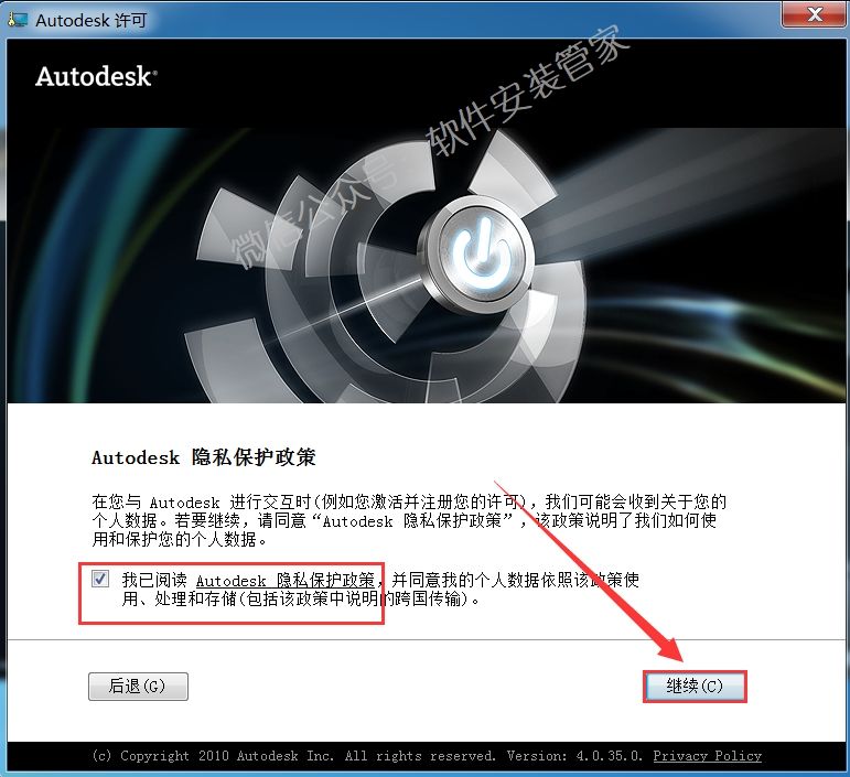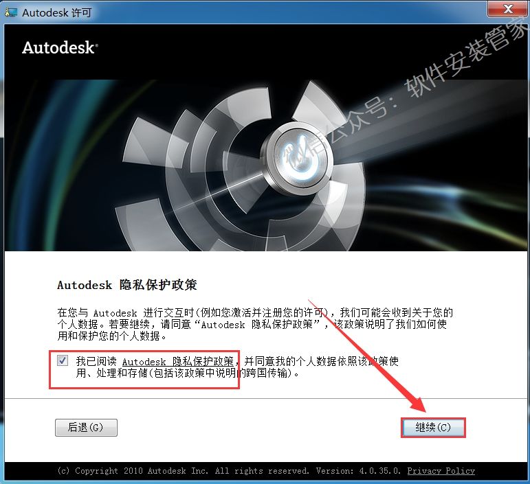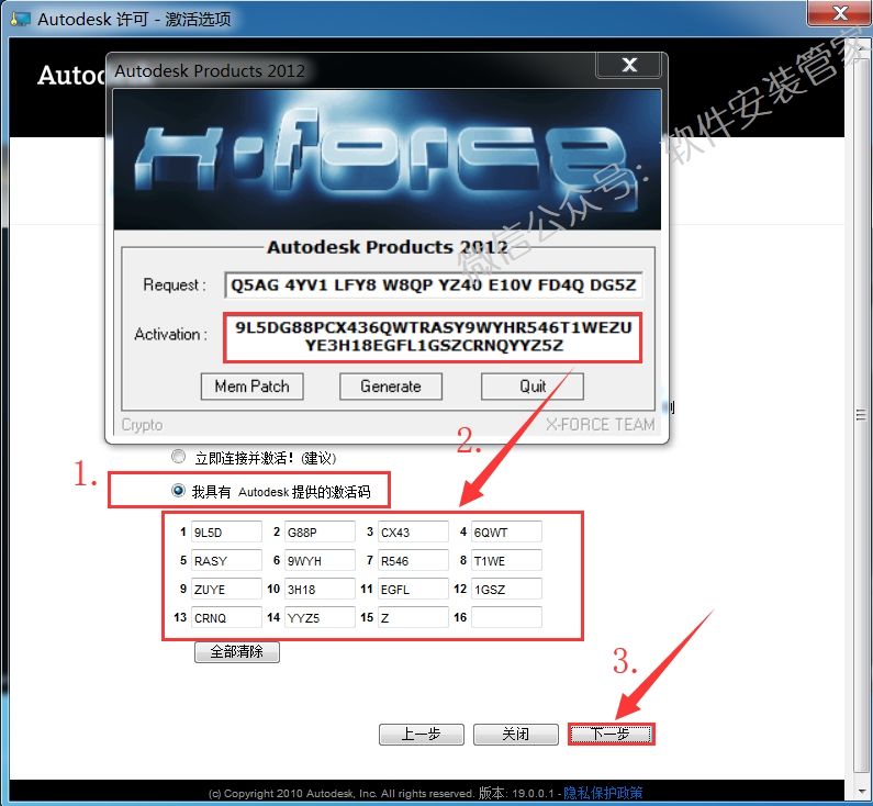 20.点击【我具有Autodesk提供的激活码】,全选【Activation】框里面生成的激活码,Ctrl+C复制,在下面的框中Ctrl+V粘贴,然后点击【下一步】。