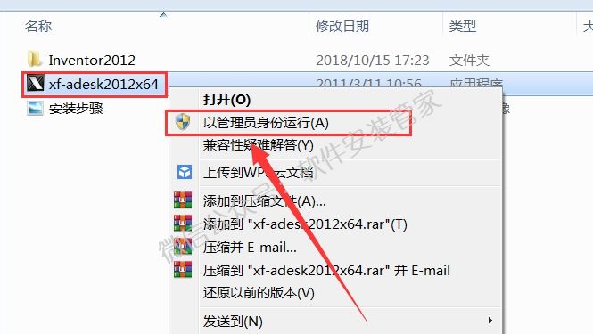 18.打开之前解压后的【Inventor2012】文件夹,选中【xf-adsk2012_x64】可执行文件,鼠标右击选择【以管理员身份运行】。