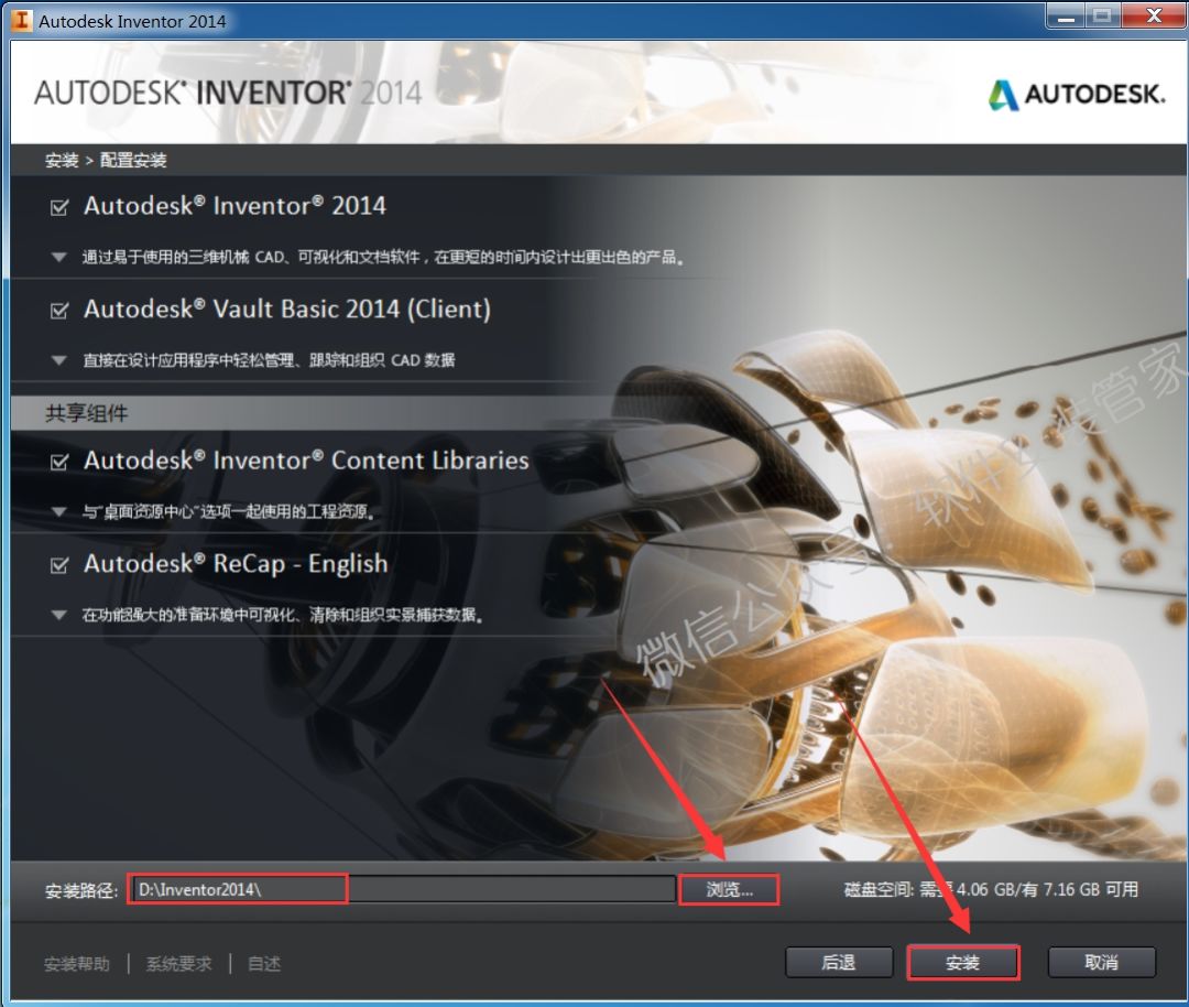 9.点击【浏览】更改软件的安装目录,建议安装在除C盘之外的其他的磁盘,可以在D盘或者其他盘新建一个【Inventor2014】文件夹,然后点击【安装】。