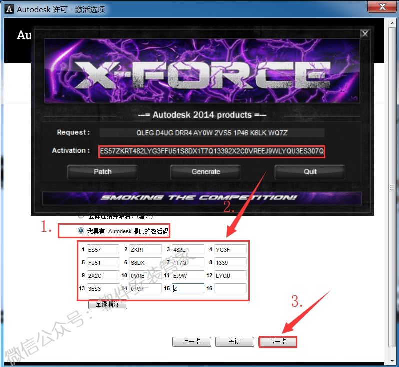 19.点击【我具有Autodesk提供的激活码】,全选【Activation】框里面生成的激活码,Ctrl+C复制,在下面的框中Ctrl+V粘贴,然后点击【下一步】。