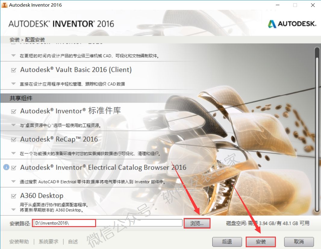 9.点击【浏览】更改软件的安装目录,建议安装在除C盘之外的其他的磁盘,可以在D盘或者其他盘新建一个【Inventor2016】文件夹,然后点击【安装】。
